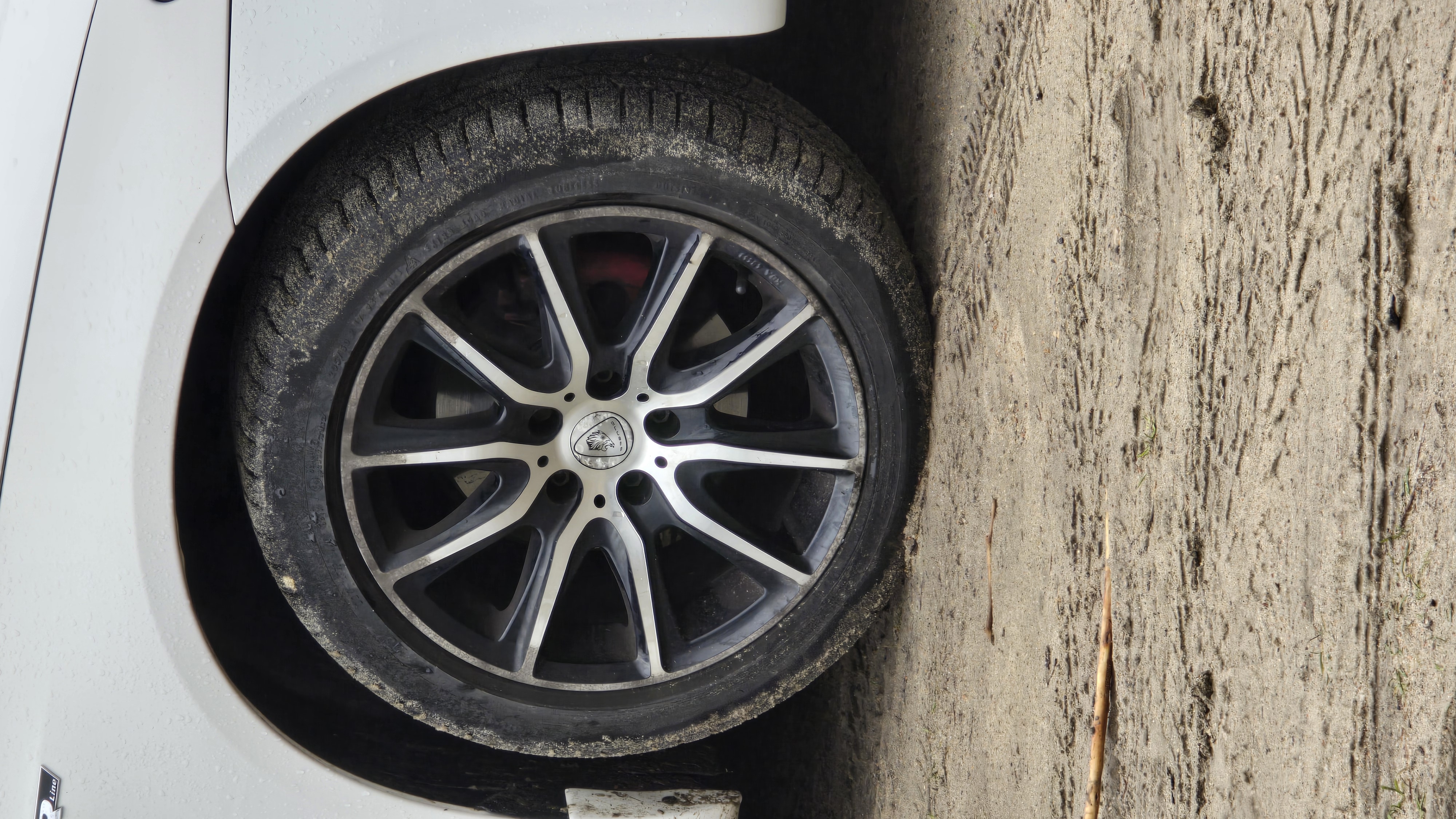 there is a white car with a black rim parked next to a wall