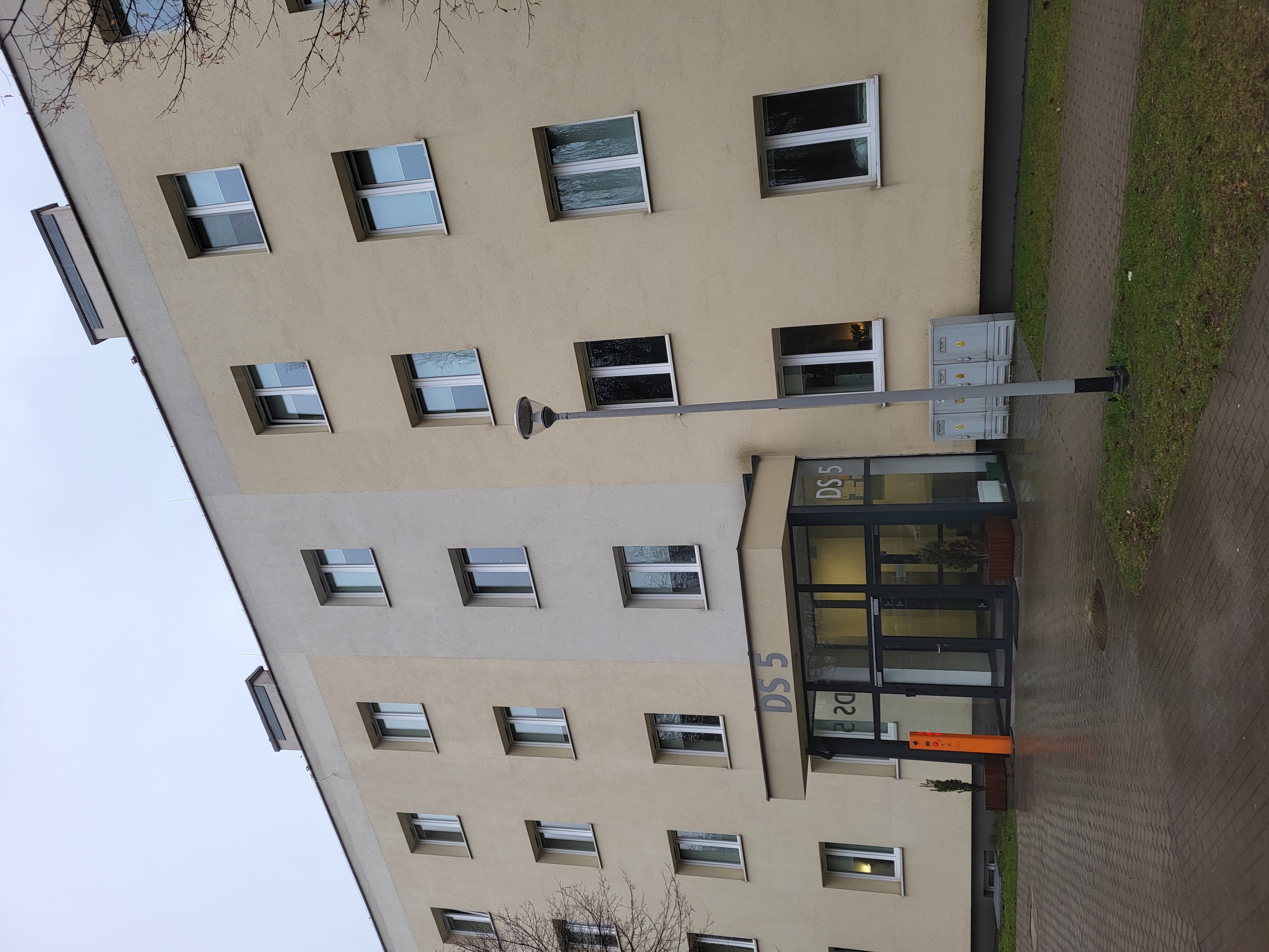 There is a tall building with a glass door and a street sign