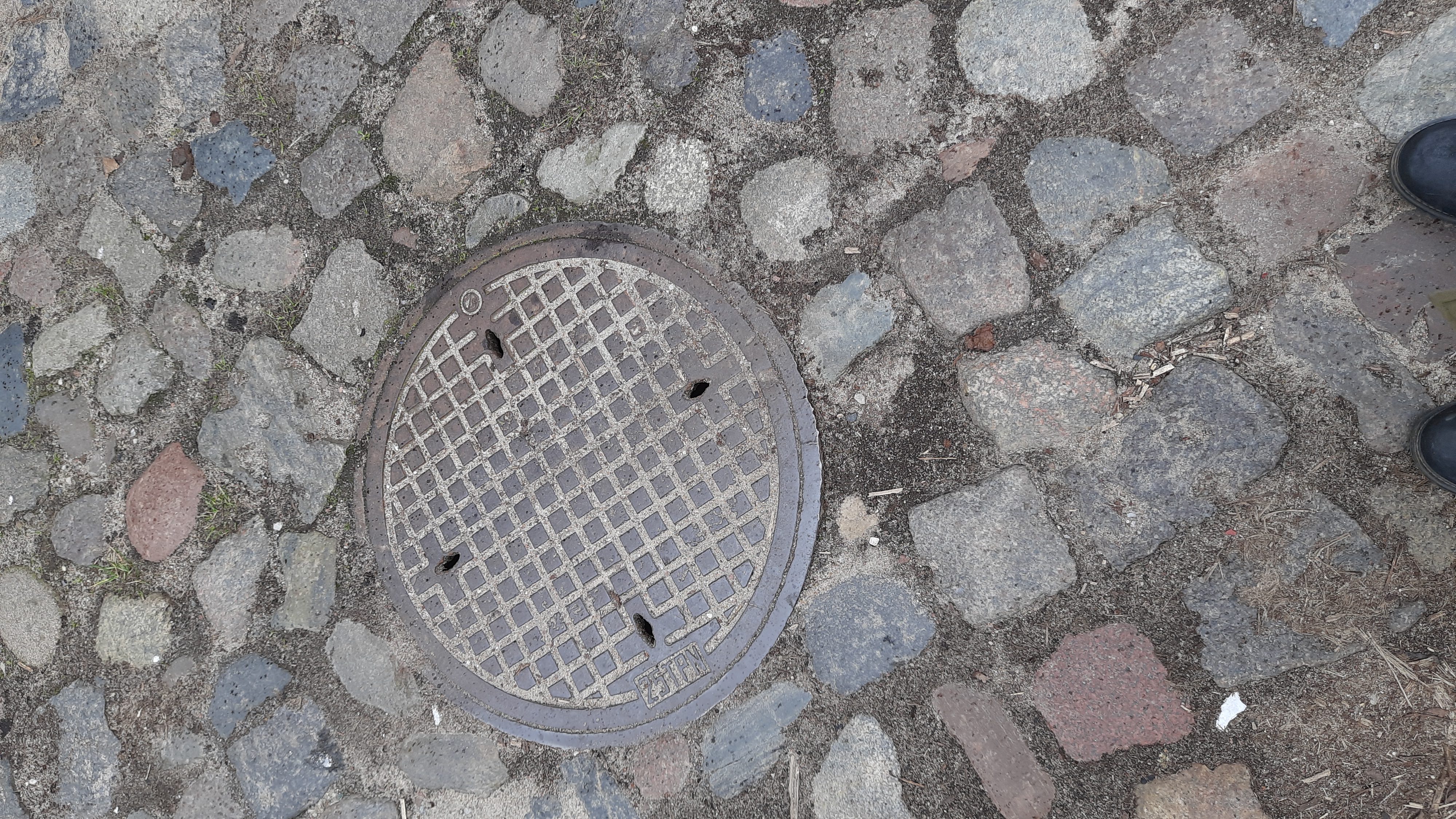 | bc.photo.description | arafed manhole with a manhole cover on a cobblestone street | |